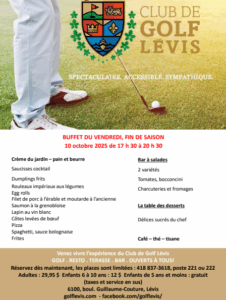 Voici notre menu table d’hôte buffet du vendredi 10 octobre 2025, fin de saison. N’oubliez pas de réserver vos places en composant le 418 837-3618 poste 221 ou 222.