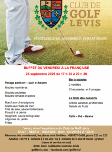 Voici notre menu table d’hôte buffet du vendredi 26 septembre 2025. N’oubliez pas de réserver vos places en composant le 418 837-3618 poste 221 ou 222.